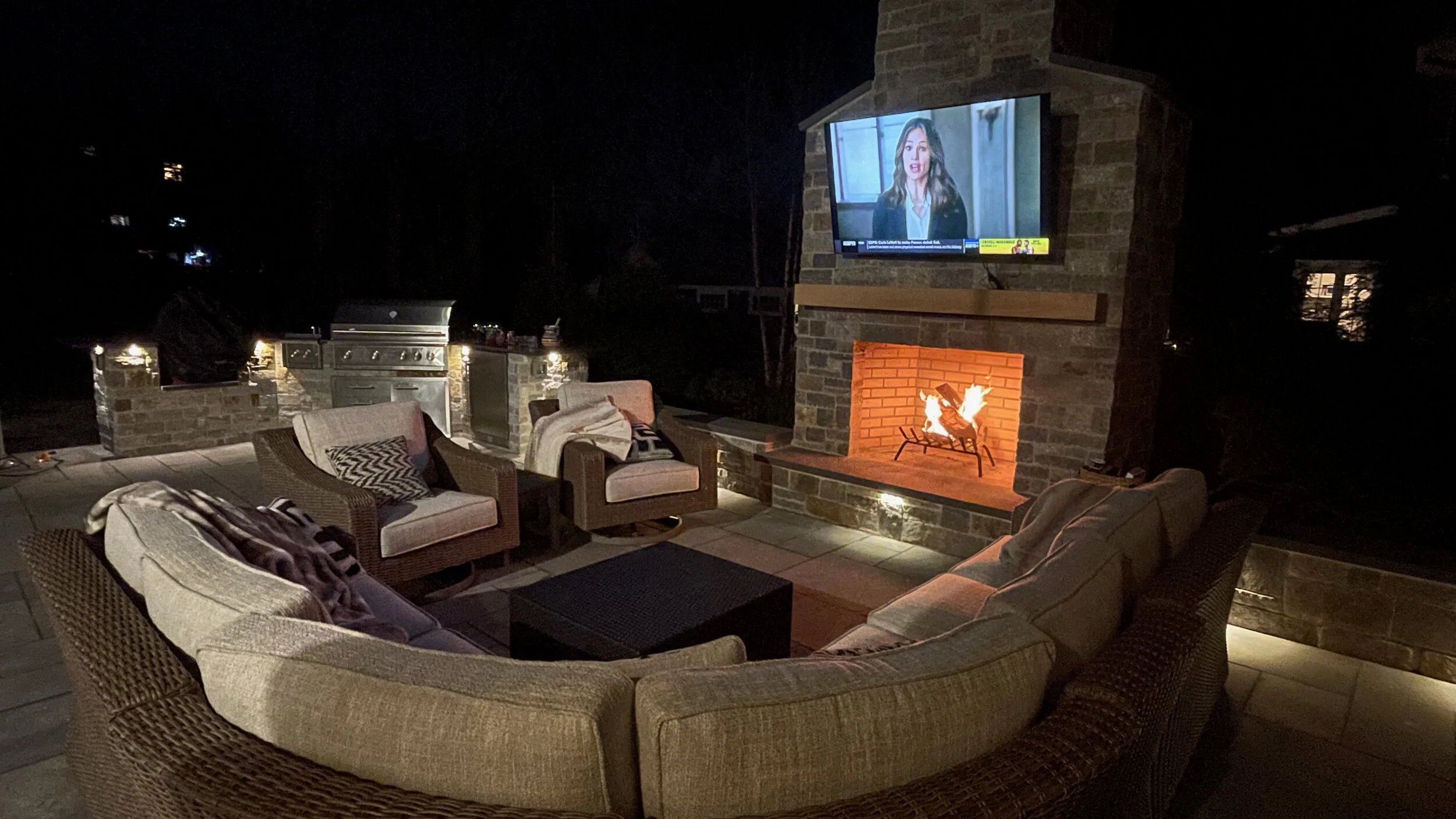 The kitchen at right is a custom brownstone kitchen island housing a grill and fridge. This project required us to match existing brownstone walls, and also included building a custom gas fire pit, shown below.